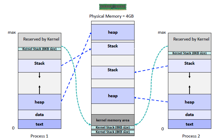 프로세스는 자기만의 고유 메모리를 가지고 있습니다. 이 고유 메모리는 논리적으로 형성되어 있으며 각 영역에 해당되는 정보들이 실제 물리적 메모리 공간에 할당이 됩니다.